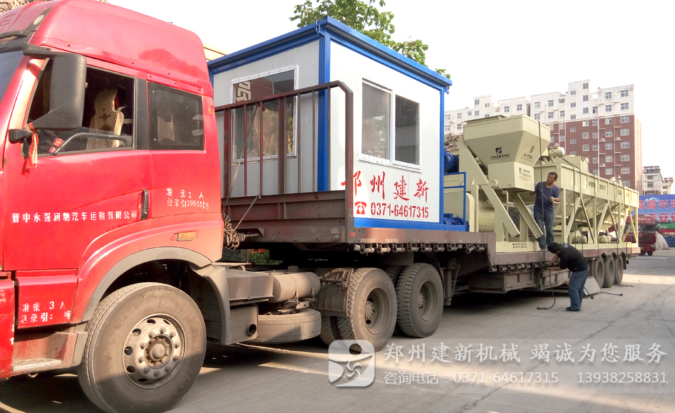图中显示一套HZS50混凝土搅拌站已经装车完毕,正在做最后的检查与固定工作,发货清单中包含了一台JS1000强制式混凝土搅拌机,一台空气压缩机,控制室一个,PLD1600混凝土配料机一套以及其它配套的组件。